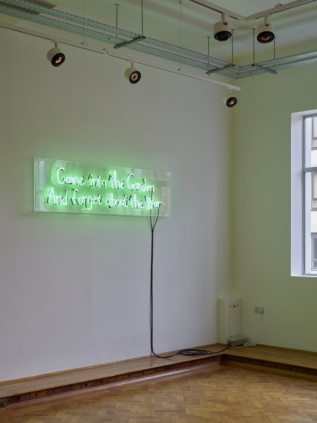 The exhibition also includes neon piece ‘War/Garden (after Tubby)’ previously shown with Golden Thread Gallery at the London Art Fair 2017, as part of our Radio Relay Project.