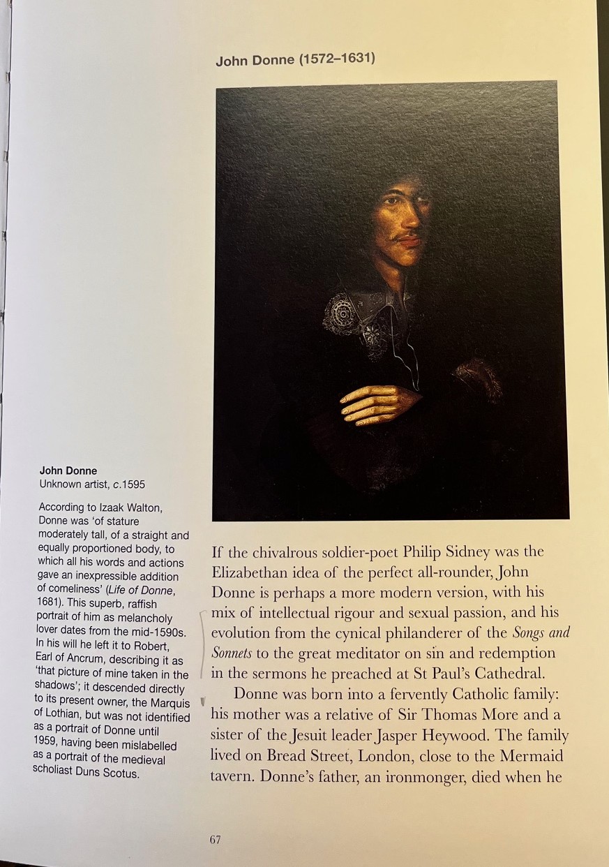 Of the poets who include Edmund Spenser of Fairie Queen fame, John Donne, Edward de Vere and Sir Walter Raleigh, John Donne is perhaps the most fascinating. The 1595 portrait shows a handsome, swarthy young rake (Nicholls typifies the early Donne as a cynical philanderer) who, in 1601, at the age of thirty-eight, married a seventeen-year-old, the union producing twelve children before she died in 1617. Whereas, however, his 1616 portrait, indicates a changed man, one who delivered famous sermons on sin and redemption at St. Paul’s Cathedral.